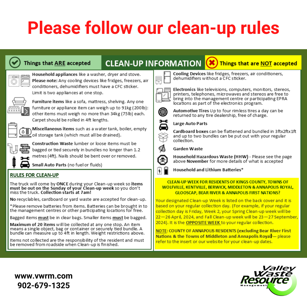 The Town of Berwick, Villages of Kingston, Greenwood, and Aylesford’s clean-up week will take place between the 14th to 18th October.