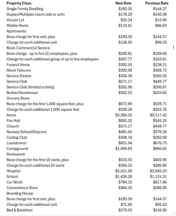 The owner of each of the following types of property or facility shall pay the following per annum. Properties may have more than one activity, as defined by property class, and will be charged for each activity on that property.